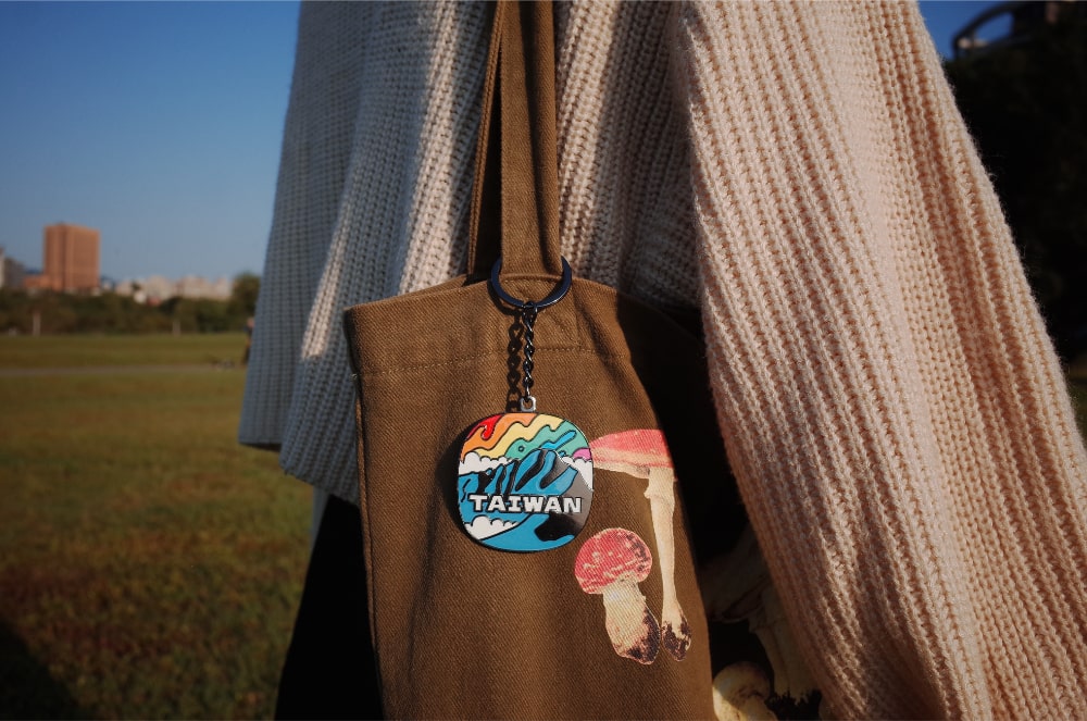 「玉見彩虹」的設計以台灣最高峰玉山為主體,與背景的彩虹山嵐相互輝映,在堅定與柔和之間,生根平權的信念。吊飾的主要材質為鐵,經烤漆、UV 噴印與電鍍處理,質感厚實有份量,好看又耐用。