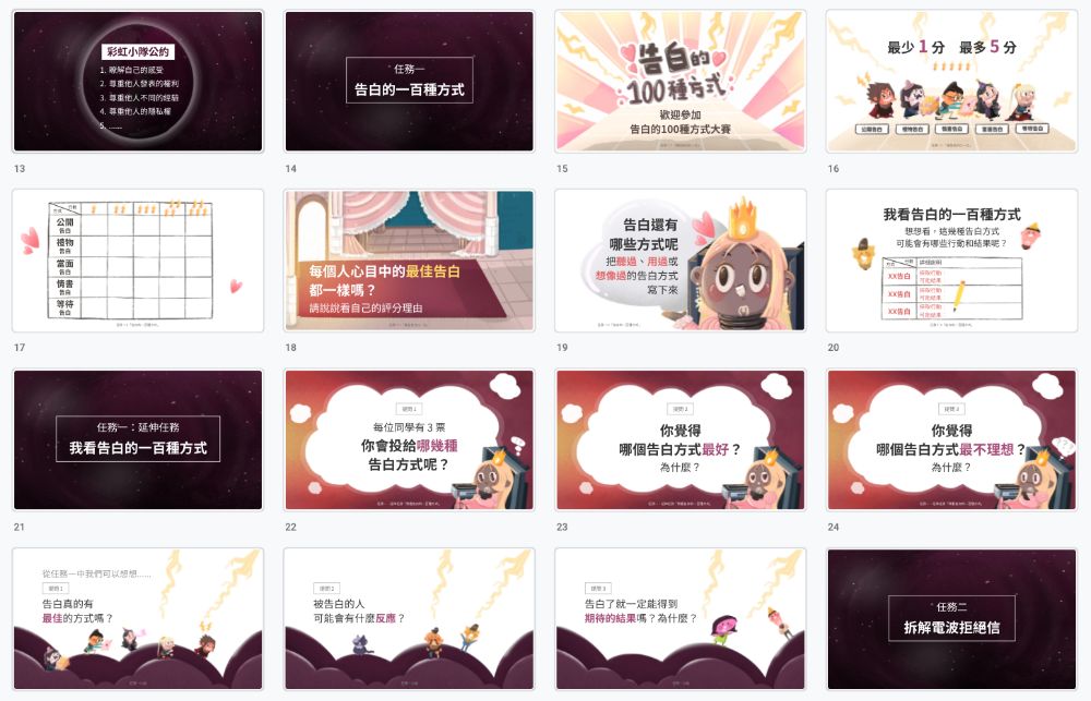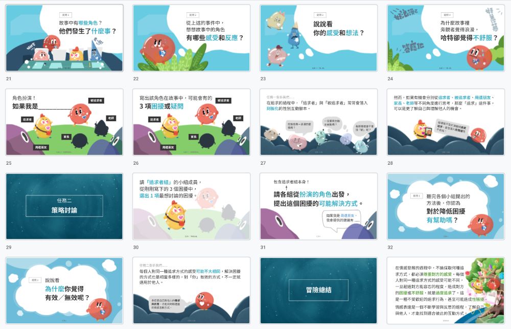 「千德爾」情感教育 12 堂課不只有教學手冊,包含豐富的教學資源,包含課程前導短片、課程簡報及學習單供師生們使用。每單元的情境故事以動畫呈現,可於影音平台免費觀看。只要訂購教學手冊,即可下載附贈的完整簡報及學習單。