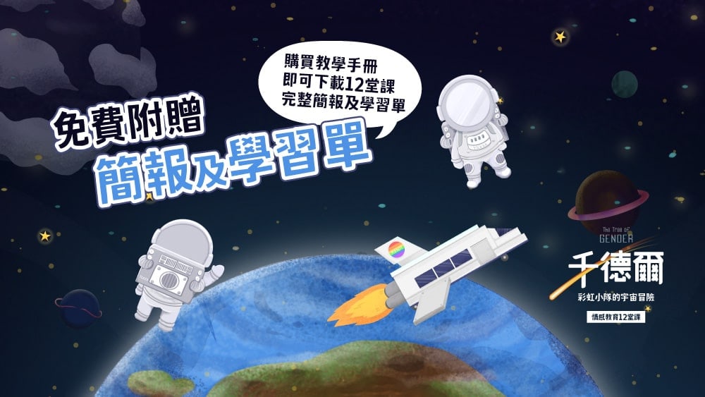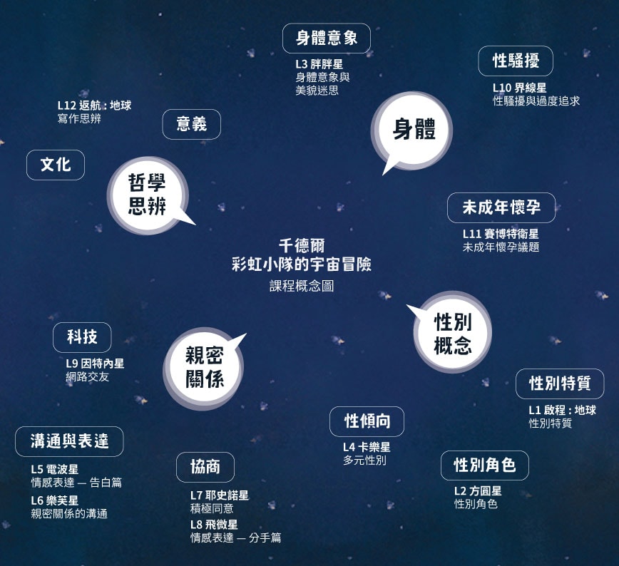 「千德爾:彩虹小隊的宇宙冒險」是一套為五到九年級學生設計的情感教育教材,目的是引導學生思考情感關係對自我和人我互動的意義、理解社會的性別框架對情感關係的影響、發展溝通協商的適切態度,以及培養問題解決的能力。